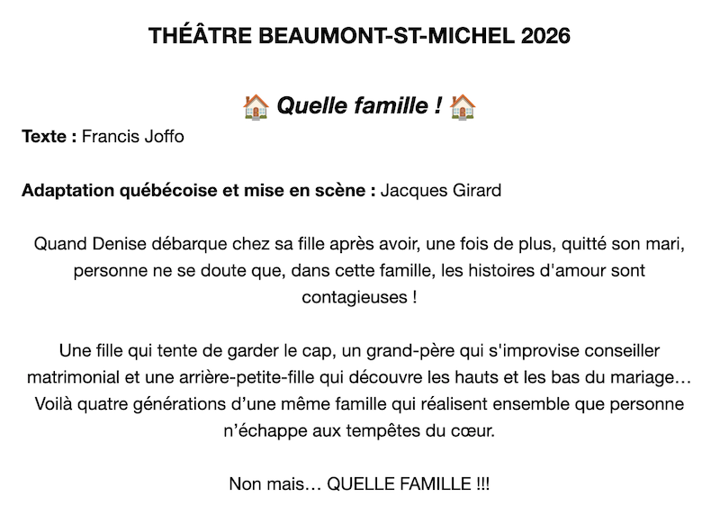 * Vous devez compléter un formulaire d’inscription pour tous les voyages de deux jours ou plus. LES GÉANTS DE LA CHANSON FRANÇAISE au Théâtre Capitole Porté par plus de vingt artistes sur scène, ce grand spectacle de variété célèbre la chanson française dans toute sa diversité : voix puissantes, chorégraphies vibrantes, éclairages spectaculaires et décors immersifs, dans une mise en scène flamboyante qui rend hommage aux géants qui ont marqué notre mémoire collective. Émotion, avant de célébrer la fête sur Éloïse, Alexandrie Alexandra ou encore Allumer le feu, dans des tableaux visuels spectaculaires. Un tableau hommage au géant Aznavour, une interprétation exceptionnelle de La vie en rose et l’Hymne à l’Amour nous suspend dans le temps. Alors que Emmenez-moi et Formidable électrisent la scène. De Charles Aznavour à Stromae, de Édith Piaf à Johnny Hallyday, ce spectacle est un voyage vibrant entre souvenirs et modernité, une grande déclaration d’amour à la chanson française. Transport : Autobus scolaire PARLEMENT DE QUÉBEC – Places supplémentaires disponibles Visite guidée du Parlement et de la bibliothèque Transport : Autobus scolaire Inscription : Claire Buteau : 2315, Bellevue, Lévis G6W 2T9 Me faire parvenir vos noms écrits comme sur votre permis de conduire ou carte d’assurance maladie ainsi que votre numéro de téléphone. PRÉVOST CAR Visite de La Cabane Comtois avec dégustation des produits de l’érable et du terroir – Dîner à Sainte-Claire – Visites guidées de l’usine Prévost Car, de la Maison du Dr. Chabot et de la Maison Eugène Prévost Coût : 189 $ (Dîner inclus – autocar de luxe) MONTRÉAL et le BIODÔME Visite guidée de Montréal avec visite du Biodôme PASSION LAVANDE Passion lavande vers la Mauricie avec dégustation THÉÂTRE BEAUMONT-ST-MICHEL CROISIÈRE EN ALASKA Coût : À partir de 6 899 $ si réservé avant le 28 novembre 2025 Info : Claire Buteau 418-456-6759 ou clairebuteau@hotmail.com PARC MARIE VICTORIN Parc Marie Victorin – visite guidée de Kingsey Falls (mosaïcultures) MONT SAINT-HILAIRE Saint-Jean-sur-Richelieu. Croisière – Dîner – PM cap vers le Mont Saint-Hilaire pour visiter la chocolaterie belge La Cabosse d’Or PARC DES CHUTES MONTMORENCY Parc de la Chute Montmorency en autobus scolaire, dîner, télécabine, visite guidée Info : Claire Buteau 418-456-6759 ou clairebuteau@hotmail.com SAFRAN À la découverte du safran, visite guidée du Centre de L’Émeu, en après-midi, visite guidée de la safranière (Safran Nordique) PORTUGAL Une dame seule aimerait être jumelée pour ce voyage