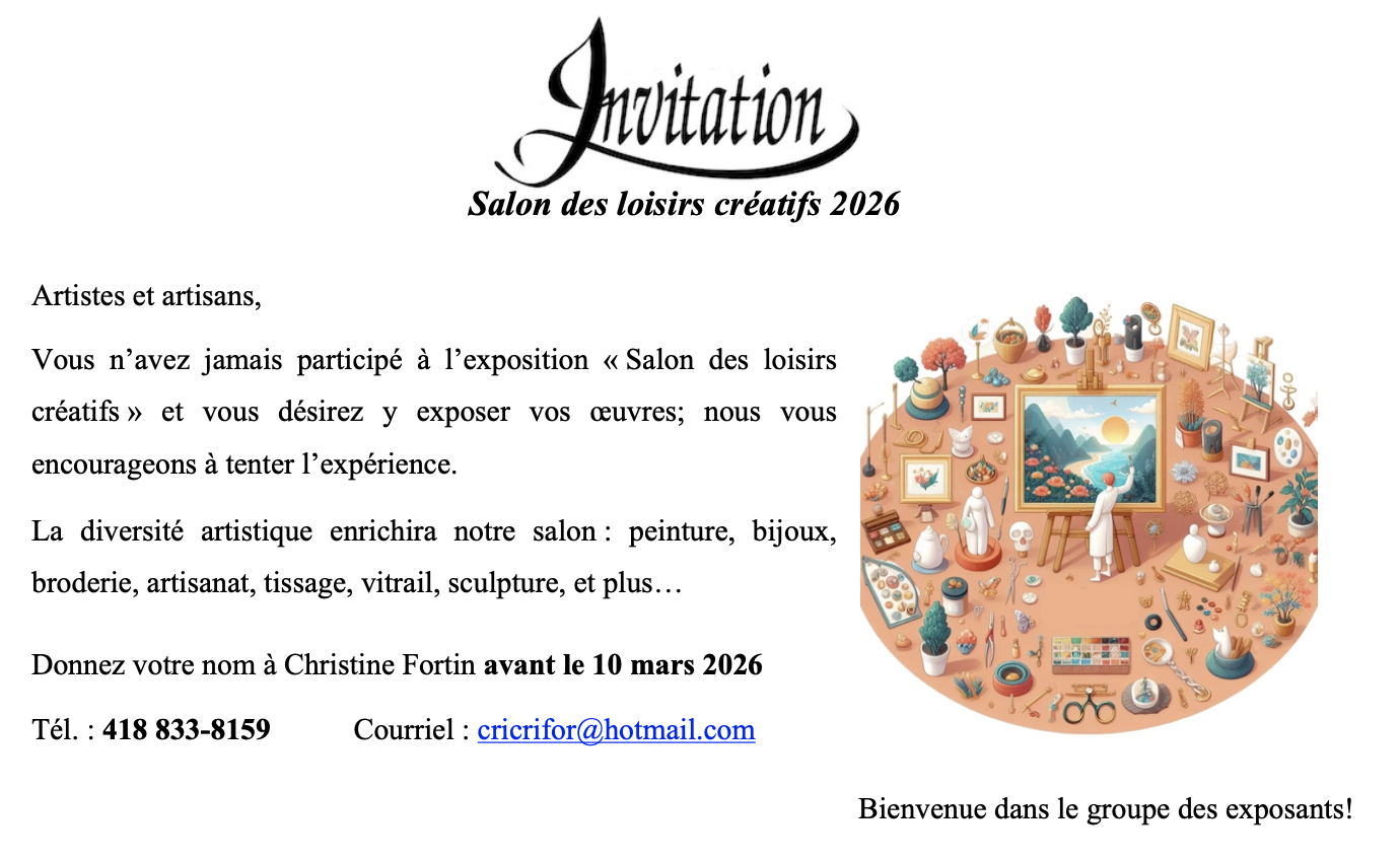 Information et inscription pour les artistes : Mme Christine Fortin au 418 833-8159 ou cricrifor@hotmail.com avant le 10 mars 2026